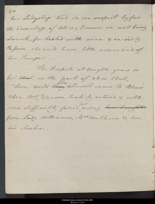 her Ladyship had in one respect by farthe advantage of Alice; I mean in not beingdrunk, for heated with wine & raised byPaſsion, she could have little command ofher Temper —.